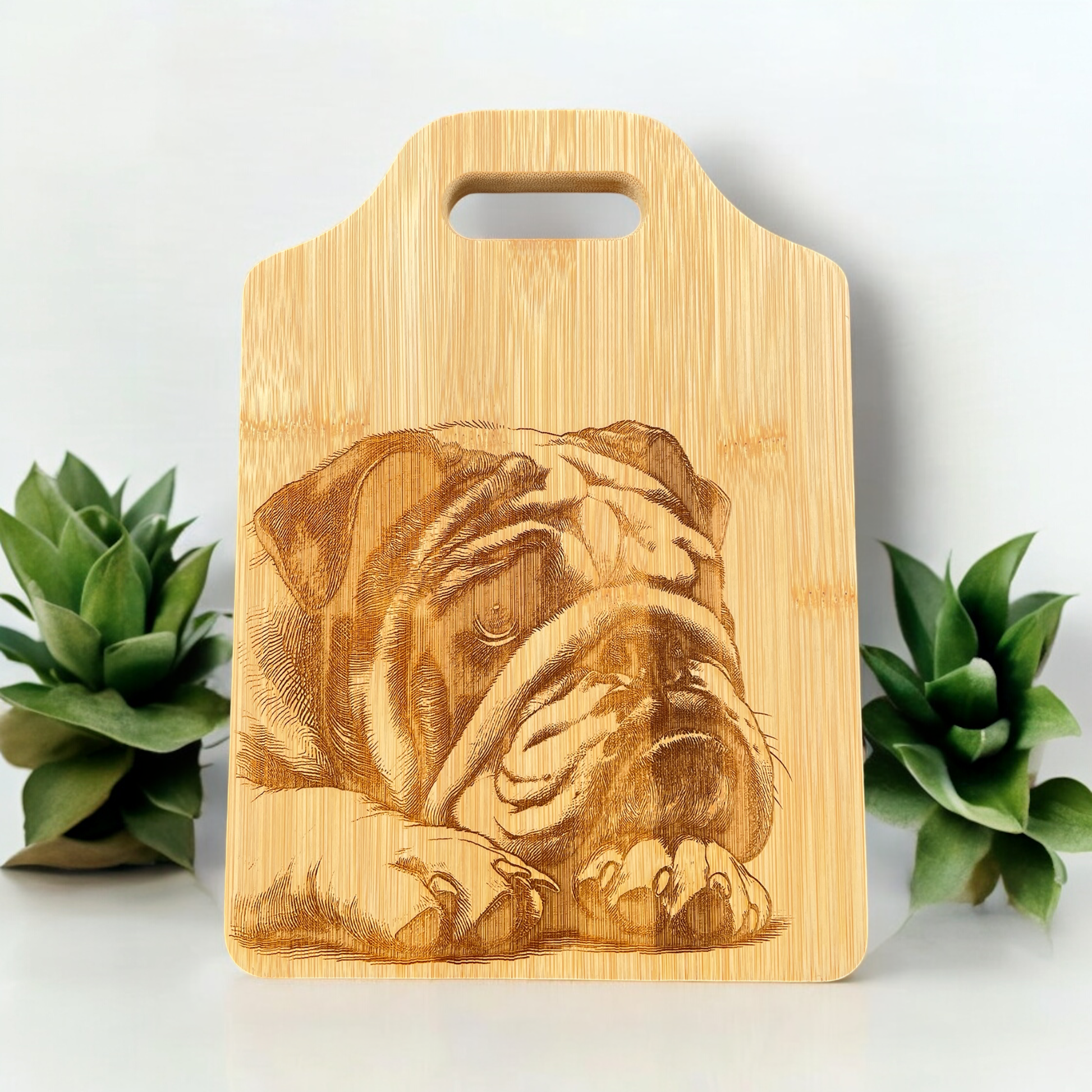 Adorable English Bulldog Engraved Bamboo Cutting Board. Available in 3 sizes: 6"x9", 8"x11" and 9"x13". Shading of the image may vary due to the natural grain of the wood.