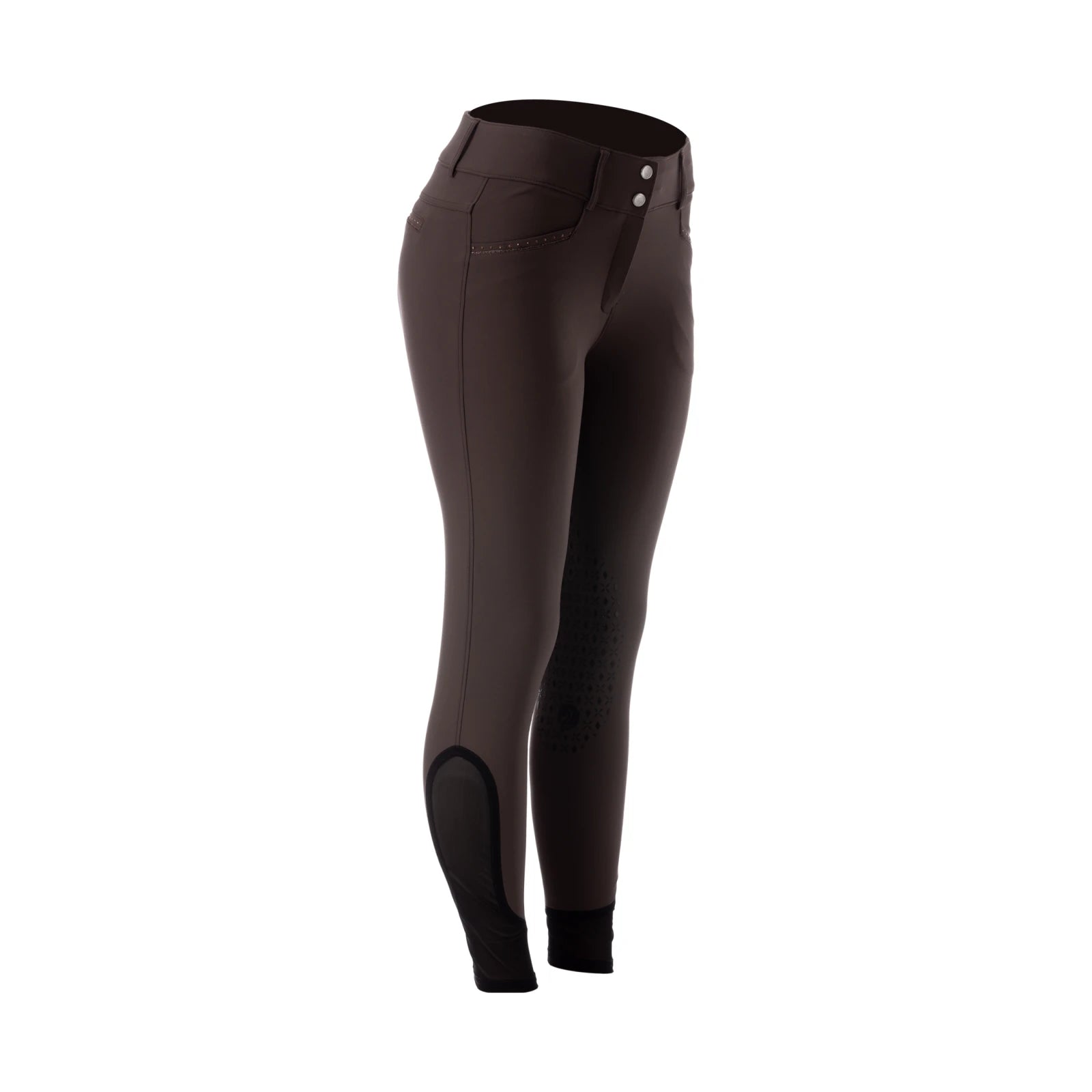 The Equinavia Victoria Womens Silicone Knee Patch Breeches are made of high quality technical fabric that is breathable, moisture-wicking, and quick-drying. Spandex provides stretch for maximum freedom and support while keeping its shape. Silicone grip knee patches offer ultimate security in the saddle, while mesh at the lower legs keeps you cool and streamlined underneath the boots. Finished with a silver lurex logo on the left pocket as well as silver piping and crystals on the front pocket and the back fake pocket will make you stand out in the ring.