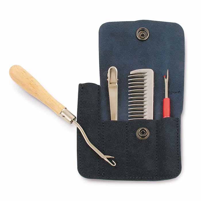 Assorted Colors Navy, Tan, Hunter Green, Brown - Leather Pouch with braid ripper, braiding hook, clip and mane comb.