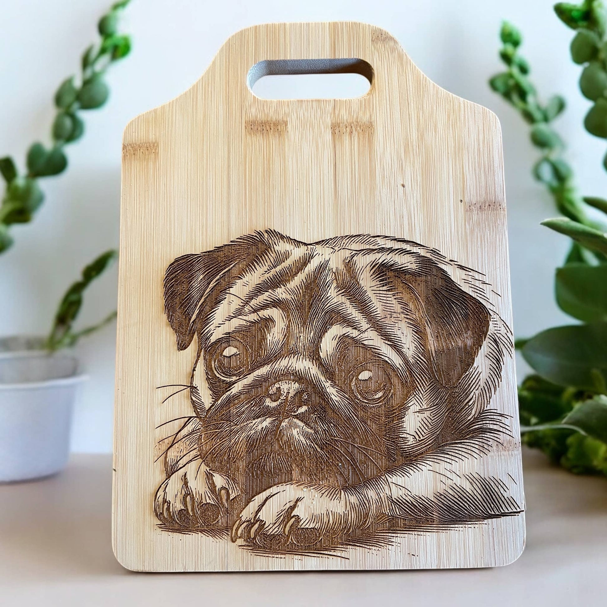 Adorable Pug Engraved Bamboo Cutting Board. Available in 3 sizes: 6"x9", 8.5" x11.5" and 9.75"x13.75". Shading of the image may vary due to the natural grain of the wood. Proudly Engraved in Oxford, Connecticut! I am happy to customize products if a certain design is needed or wanted and not shown in my shop!