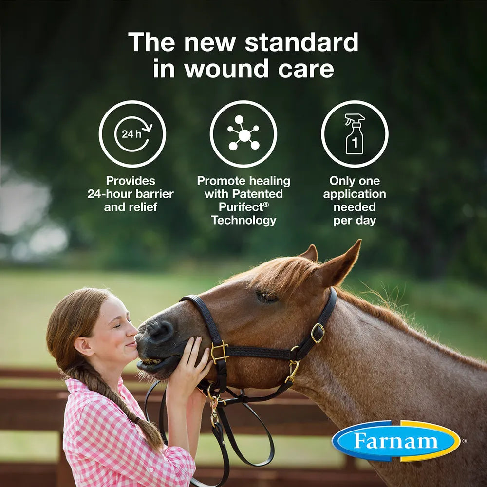 Creates a flexible and breathable barrier on wounds to protect animal during recovery. Provides long-lasting relief and cleans wounds without burning or stinging. Safe and effective for wounds, cuts, burns, post-surgical sites, sores, abrasions, skin irritations, scratches, bites, kicks and more on horses, livestock, dogs and cats. Patented Purifect™ Technology uses the breakthrough Ceragenin molecules to mirror the natural immune system and accelerate recovery.