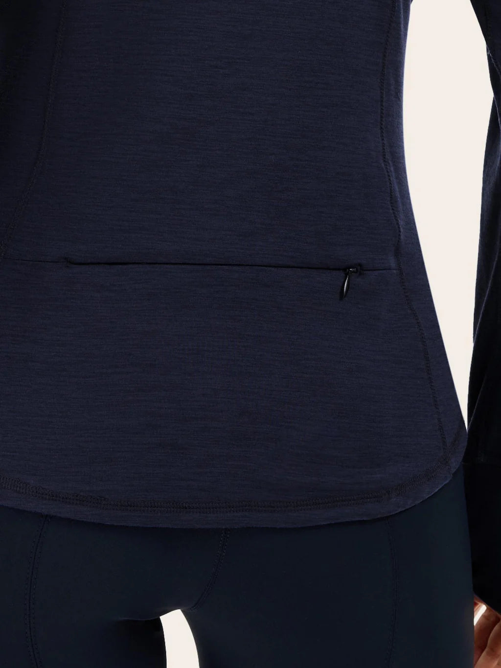 • Modern layering piece • Wicking & stretch fabric with soft, warm hand feel • UPF 30 sun protection • Back zipper pocket