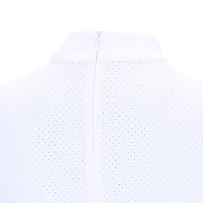 This functional women's show shirt impresses with its all-over perforated structure, which ensures excellent ventilation and optimal comfort. The concealed zipper in the back provides a sleek and comfortable fit. The rhinestone horse logo on the collar and left sleeve hem adds a touch of sparkle and lends the shirt an elegant flair.