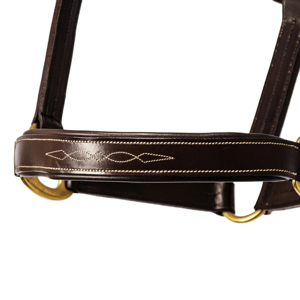 Our buttery soft, ultra-premium padded leather halter features supple leather that feels broken in from the jump. We padded the crown and the noseband for comfort, but left the cheeks unpadded for easy plating. Both the crown and the noseband feature elegant fancy stitching, while the cheek and chin pieces feature classic triple stitching. Straight chin.Finished with a rolled throat, solid brass hardware, and a small TackHack "T" logo on the left cheek buckle.
